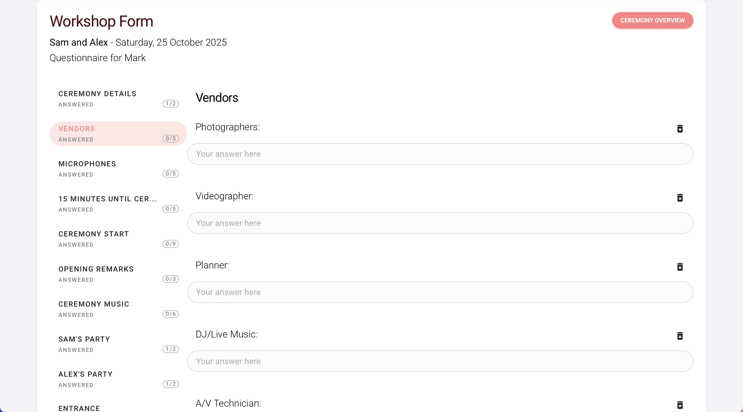 Follow the built-in prompts with your couple to craft all the particular sections and unique details of their ceremony, and even add your own elements as you go.