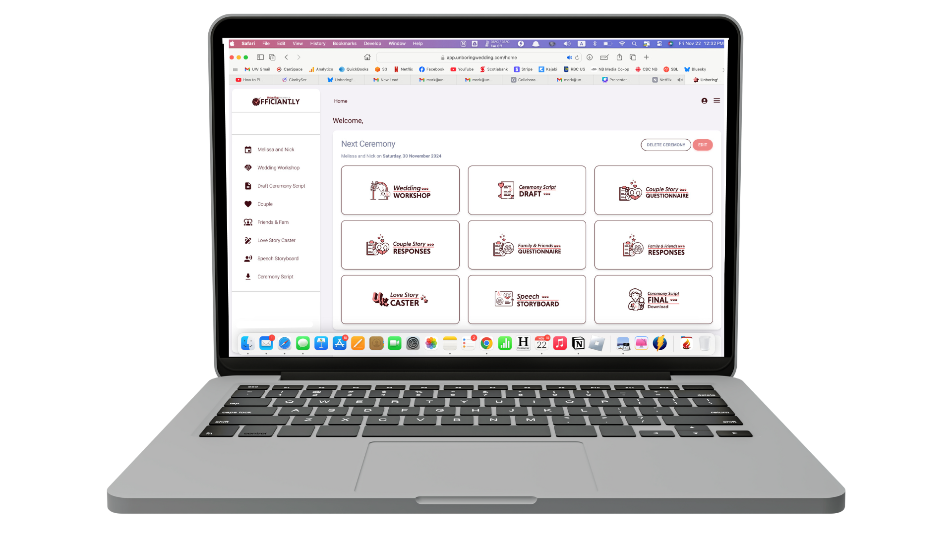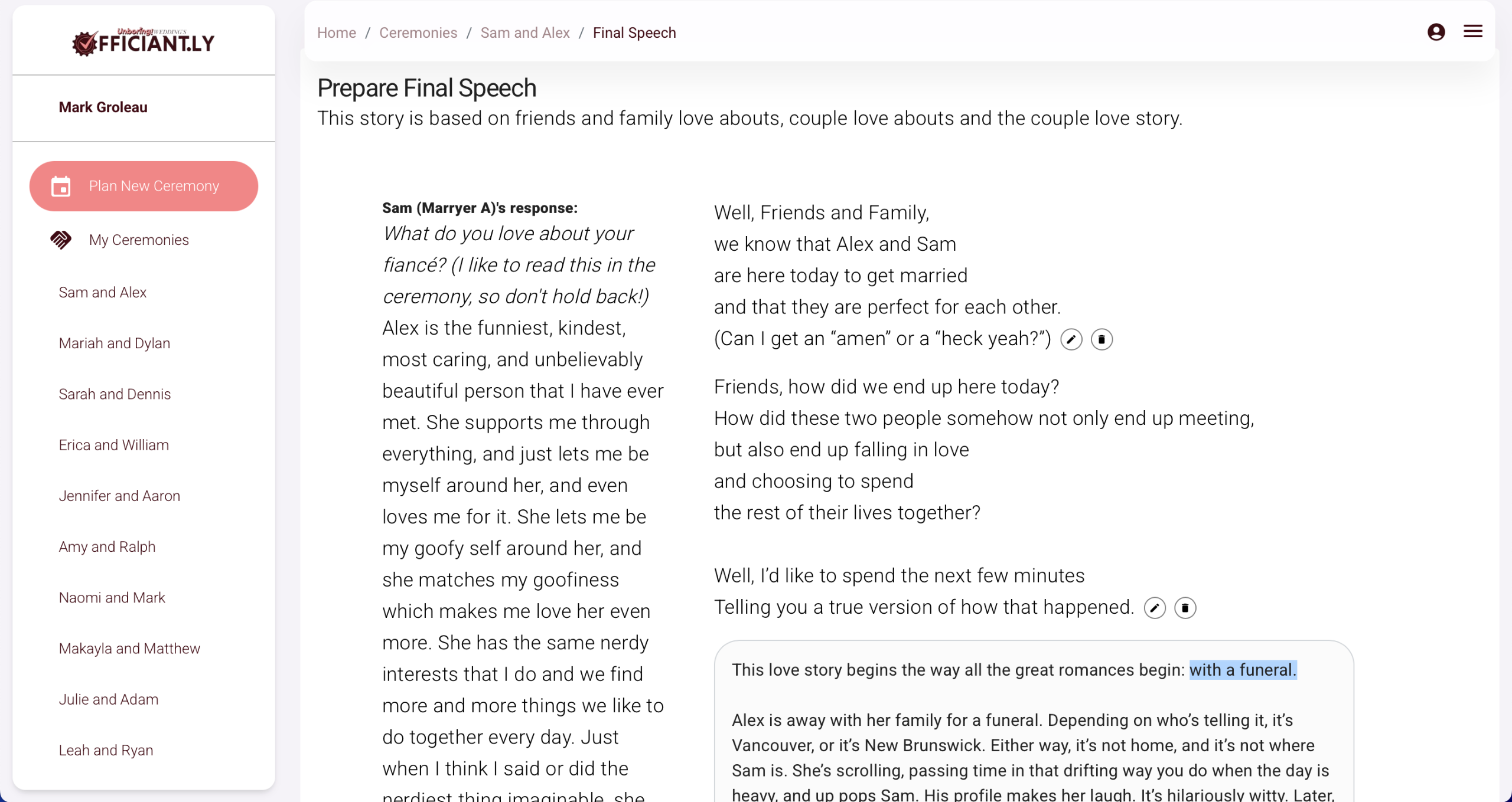 Scripts are built, emails are sent, questionnaire replies are imported, the love story is generated, and the final draft is exported - all with Officiantly©.