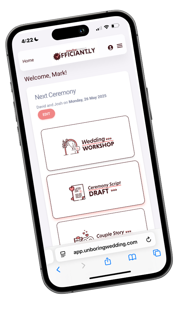 They start in Officiantly© with the professional script I've spent years developing and use every weekend. They never start from scratch!