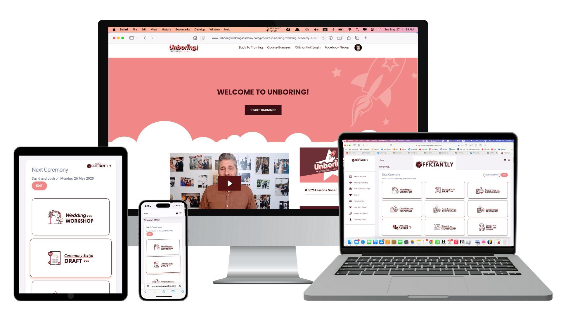 Unboring!Wedding Academy is our 6-stage program you follow step by step. It teaches the officiant how to become the best with an A-Z porcess. Includes is our ceremony-builder software Officiantly©, and members get free full-feature access to create their ceremony. It's total automation they need to do it all as close to effortlessly as possible.