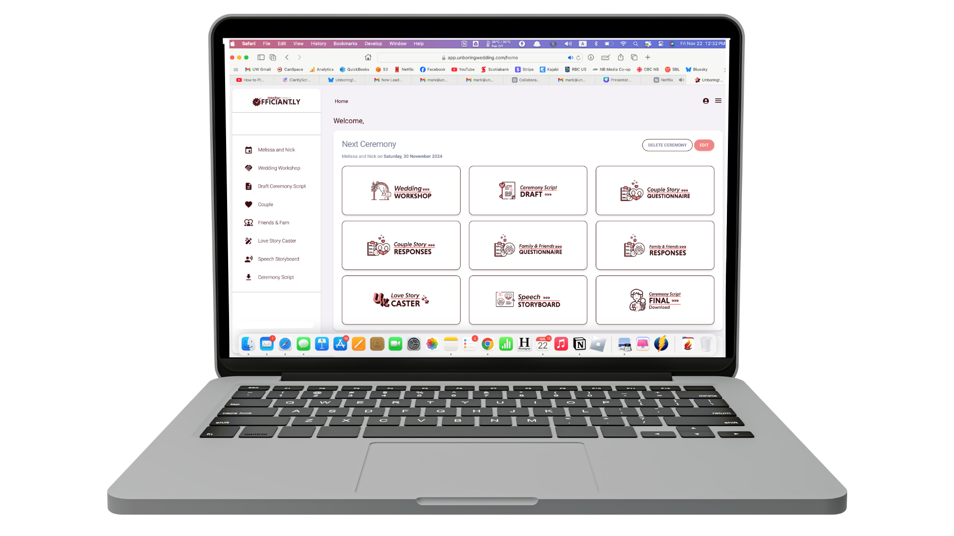 Scripts are built, emails are sent, questionnaire replies are imported, the love story is generated, and the final draft is exported - all with Officiantly©.